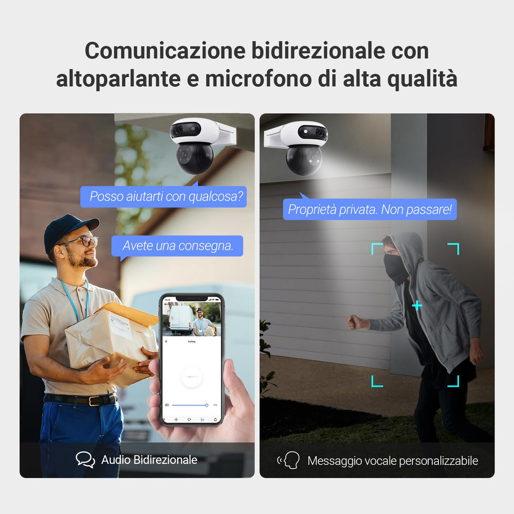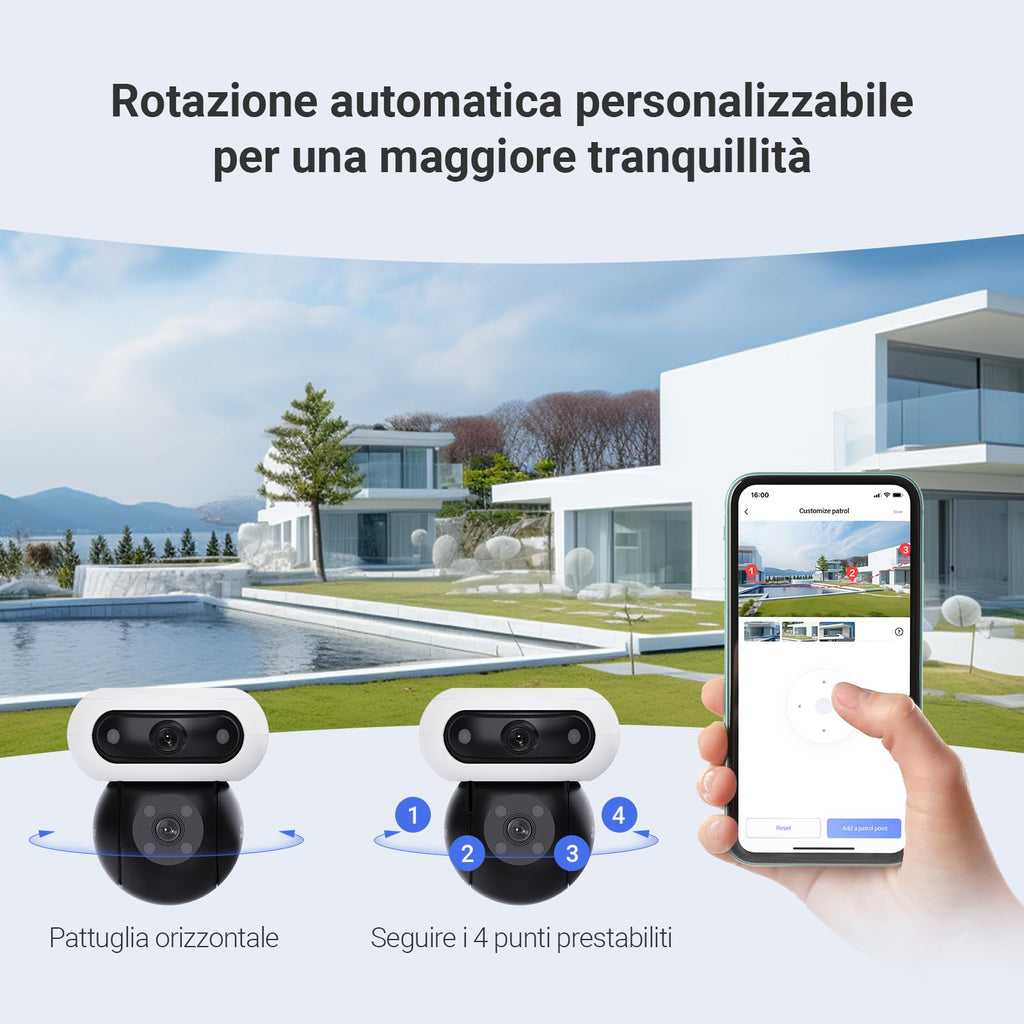 - 【Doppio Obiettivo 2K+ (4MP+4MP) e Copertura Panoramica a 360°】Dotata di due obiettivi 2K+, la telecamera di sorveglianza wifi C90 cattura ogni dettaglio. È possibile controllarla facilmente con un semplice gesto per passare da una visualizzazione all'altra. La telecamera per esterni offre due modalità di pattugliamento automatico: l'obiettivo superiore (4MP) ruota orizzontalmente per una copertura completa, mentre l'obiettivo inferiore (4MP) si muove verticalmente per seguire i movimenti rilevati.