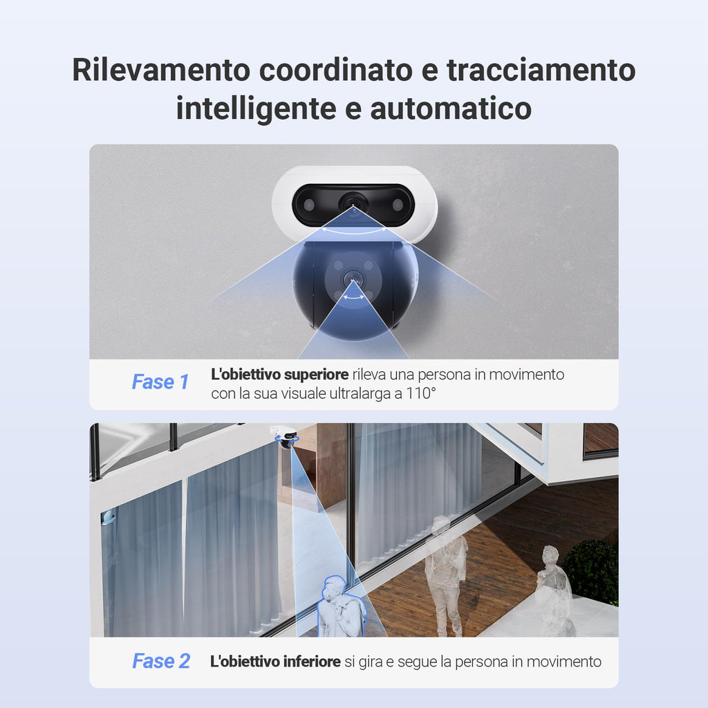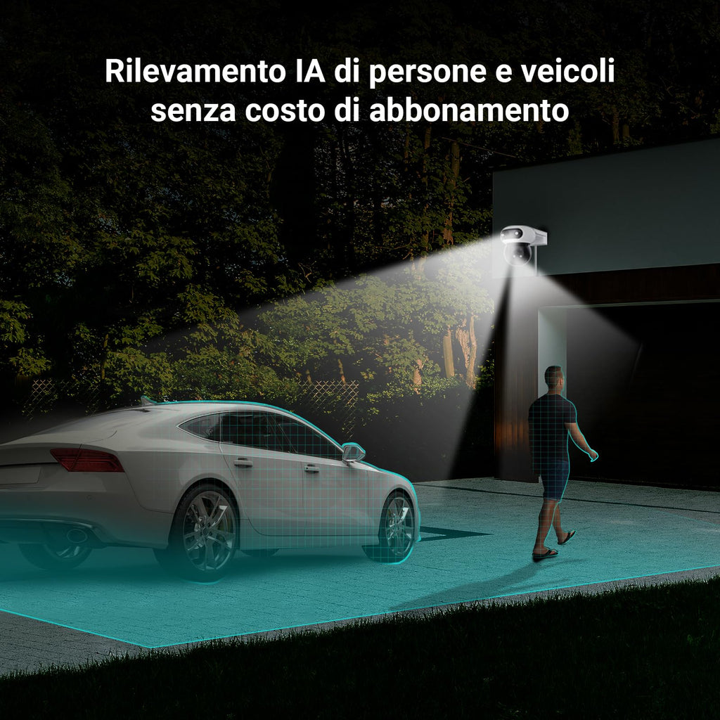 - 【Rilevamento dei Modelli di Persone e Veicoli e Tracciamento Automatico Intelligente】 la telecamera di sorveglianza per esterni è dotata di un obiettivo superiore che offre un angolo di visuale ultra ampio di 130° per rilevare le persone in movimento. Allo stesso tempo, l'obiettivo inferiore ruota automaticamente per seguire le persone rilevate, garantendo una sorveglianza continua e accurata. Inoltre, grazie alla co-detection avanzata con AI, la telecamera di sorveglianza identifica e traccia automaticamente le sagome umane e i veicoli, fornendo avvisi precisi e istantanei per una maggiore sicurezza.