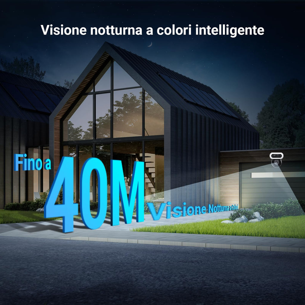 - 【Modalità di Vsione Notturna Fino a 40m】Dotata di un'eccezionale visione notturna a colori, la telecamera di sorveglianza wifi per esterni è arricchita da 4 proiettori integrati per immagini nitide anche nel buio più totale. La telecamera di sorveglianza offre tre modalità di visione notturna per soddisfare ogni esigenza: modalità a colori per la massima chiarezza, modalità intelligente che passa automaticamente al colore quando viene rilevato un movimento e modalità in bianco e nero per una maggiore visibilità in condizioni di scarsa illuminazione. Con un raggio di visione notturna fino a 40 metri.
